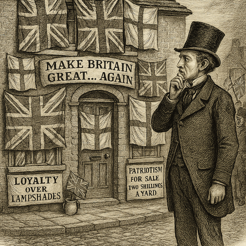 It’s no surprise that in a nation built on tea, biscuits, and the occasional desperate desire to cling to something — anything — that we end up reeling into a world of flag-waving to prop up the crumbling edifice of our pride.